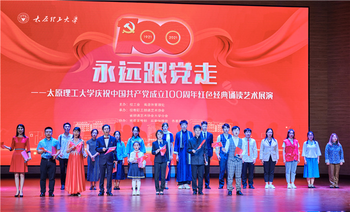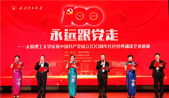 6月7日晚,我校庆祝中国共产党成立100周年红色经典诵读艺术展演在明向校区学生活动中心举行。本场展演由校工会、离退休管理处主办,校教职工朗诵艺术协会、省朗诵协会大学分会承办,党委宣传部、后勤保障处协办,共有13个基层工会和校朗诵艺术协会选送的16个优秀作品参演。本场展演既是学校庆祝中国共产党成立100周年系列活动之一,也是省委宣传部指导的,省教育厅、省文旅厅、省体育局、省广电局、省总工会、团省委、省妇联、省文联主办的2021年“永远跟党走”全省群众性文化活动之一。山西省朗诵艺术协会负责同志,学校各有关单位负责同志等出席展演。